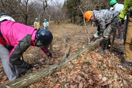 @宇津木緑地保全地域伐採、枝払い、丸太運び、薪割り、自然観察、茶の木・梅の木の剪定