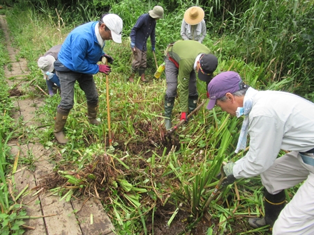 高さを抑えるための竹の丈詰めと、キショウブの生育範囲拡大を防ぐための花芽切りを行なう予定です。