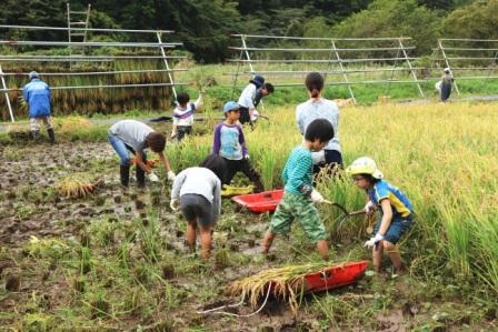 当日は、田んぼに実った稲をみんなで収穫します。ザク!ザク!と鎌で稲を刈る感触はやみつきです。「はざかけ」と呼ばれる稲を天日干しする作業が終わって谷戸を見渡せば、秋の里山の風景が目の前に現れます。